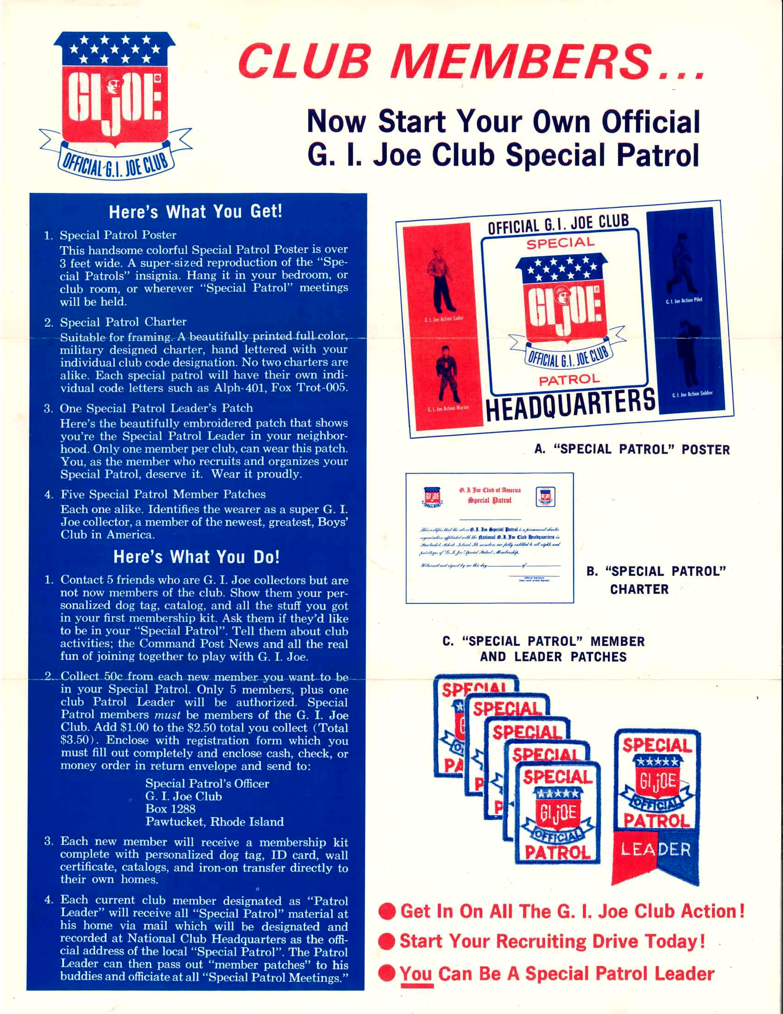 In 1965, Hasbro marketed the GIJOE Club to boys by encouraging groups of 5 to join the club together and form a "Special Patrol". Each member would receive his membership kit mailed to his residence. One member designated as the "Special Patrol" Leader would receive in addition to his membership kit, a "Special Patrol" kit which included;